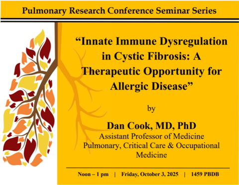 Breadcrumb Home News News Pulmonary Research Conference (10/3/25) Monday, September 29, 2025 Image Gallery “Innate Immune Dysregulation in Cystic Fibrosis: A Therapeutic Opportunity for Allergic Disease”By: Dan Cook, MD, PhDAssistant Professor of Internal MedicinePulmonary, Critical Care & Occupational Medicine Noon – 1 pm1459 PBDB Gallery