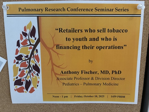 Breadcrumb Home News News Pulmonary Research Conference (10/6/25) Monday, October 6, 2025 Retailers who sell tobacco to youth and who is financing their operationsBy: Anthony Fischer, MD, PhDAssociate Professor & Division DirectorPediatrics – Pulmonary Medicine Noon – 1 pm1459 PBDB