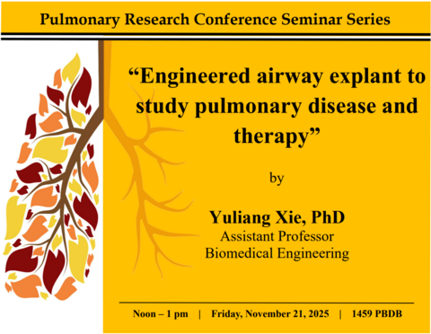 Breadcrumb Home News News Pulmonary Research Conference (11/21/25) Monday, November 17, 2025 “Engineered airway explant to study pulmonary disease and therapy”By: Yuliang Xie, PhDAssistant ProfessorBiomedical Engineering Noon – 1 pm1459 PBDB