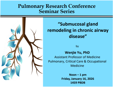 Breadcrumb Home News News Pulmonary Research Conference (1/16/26) Monday, January 12, 2026 "Submucosal gland remodeling in chronic airway disease"By: Wenjie Yu, PhDAssistant Professor of MedicinePulmonary, Critical Care & Occupational Medicine Noon – 1 pm1459 PBDB